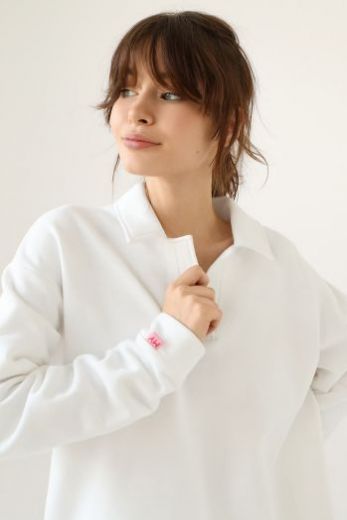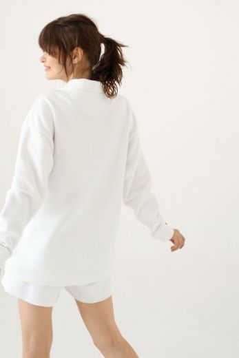 Женский свитшот поло с воротником свободного силуэта из премиального футера. Обьемный крой, удлиненный рукав, спущенное плечо и теплый материал подарят ощущение комфорта и уюта.