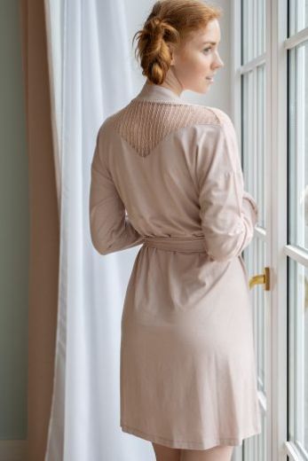 Женский домашний халат-пеньюар, без пуговиц, на запАх, средней длины, с длинными рукавами. Выполнен из благородного трикотажа цвета пыльной розы с серебристым блеском. Кружевная кокетка и отделка рукавов придает изюминку этой модели. Необыкновенная мягкость ткани на основе вискозы окутает Вас уютом и комфортом. Комплект можно дополнить сорочкой D-30 или пижамой М-122/Р-98.