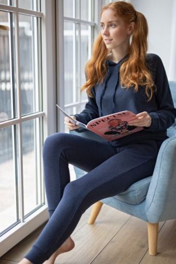 Женский костюм для дома и отдыха – худи и джоггеры. Мягкий трикотаж, визуально и тактильно аналогичный кашемиру, окунает Вас в океан безмятежности и комфорта. Брюки с карманами, на манжетах. Худи имеет кулиску в капюшоне. Рукава-реглан, на манжетах. Приглушенный темно-синий цвет выглядит благородно и дорого.