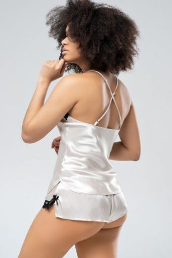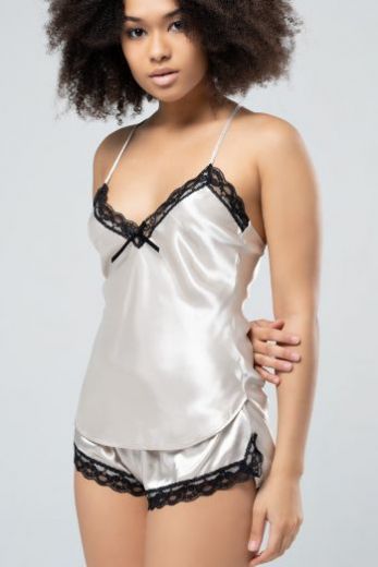 Топ из атласной ткани на тонких регулируемых бретелях, украшен контрастным кружевом, отлично смотрится в комплекте с шортиками 410 или 411.