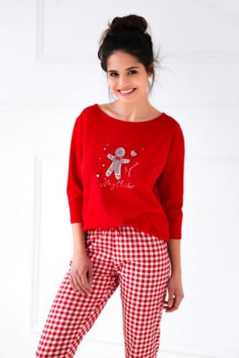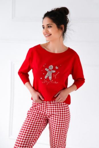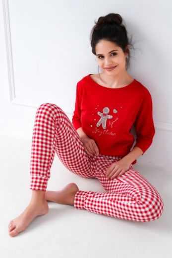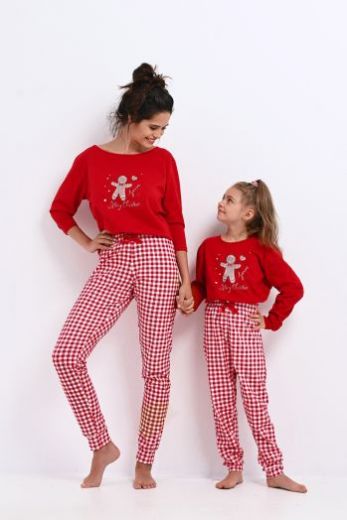 Хлопковая пижама Christmas Cookie состоит из лонгслива с рукавами 3/4 и мультяшным принтом и зауженных к низу брюк красную и белую клетку. Элемент декора-бантик.
