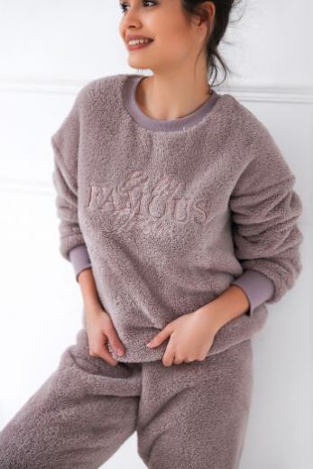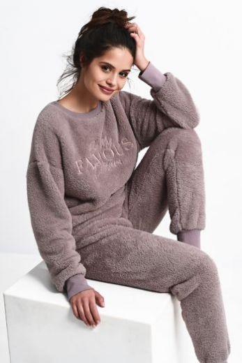Необычная пижама Georgette состоит из толстовки с надписью и зауженных брюк. На рукавах и брюках манжеты. Отличный вариант для уютного отдыха дома.