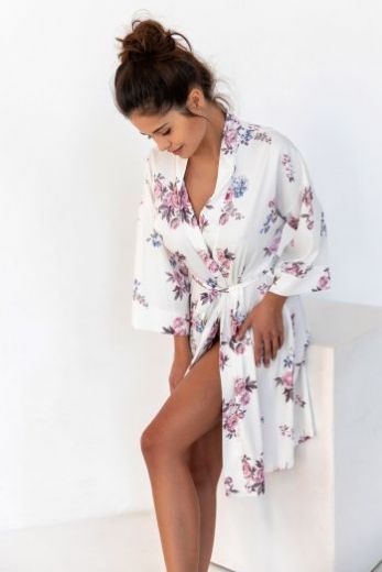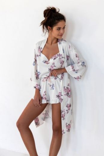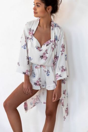 Атласный запашной халат Lucretia с длинными рукавами, декорирован очаровательным цветочным принтом. В комплекте идет пояс. Идеальный вариант для домашнего отдыха.