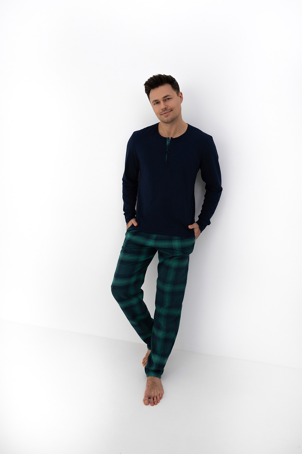 Мужская пижама Luke состоит из лонгслива с длинными рукавами и брюк прямого кроя в крупную клетку. Круглый вырез горловины, воротник на кулиске. Брюки оформлены удобными карманами. Идеальный вариант для домашнего отдыха.