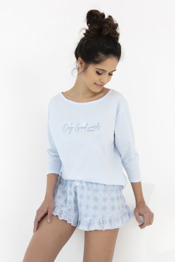 Хлопковая пижама Angela состоит из голубого лонгслива с надписью на груди и шорт с рюшами. Лонгслив свободного кроя с рукавами 3/4 и круглым вырезом горловины. Шорты на мягкой широкой резинке. Идеальный вариант не только для сна, но и для домашнего отдыха.