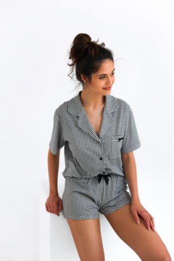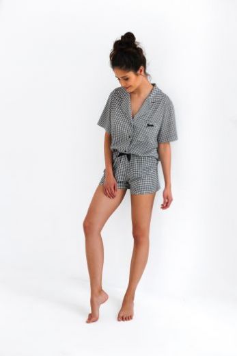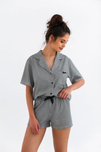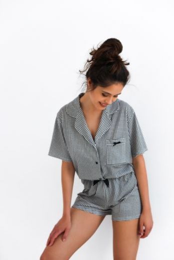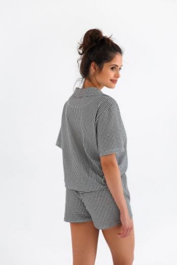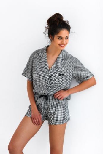 Стильная пижама Arianna состоит из рубашки с коротким рукавом и шорт. Выполнена в классическом стиле с принтом клетка. Элемент декора: бантик.