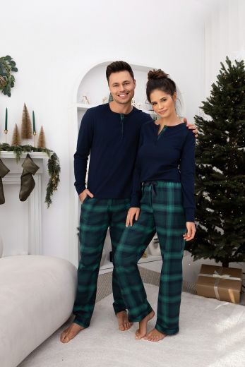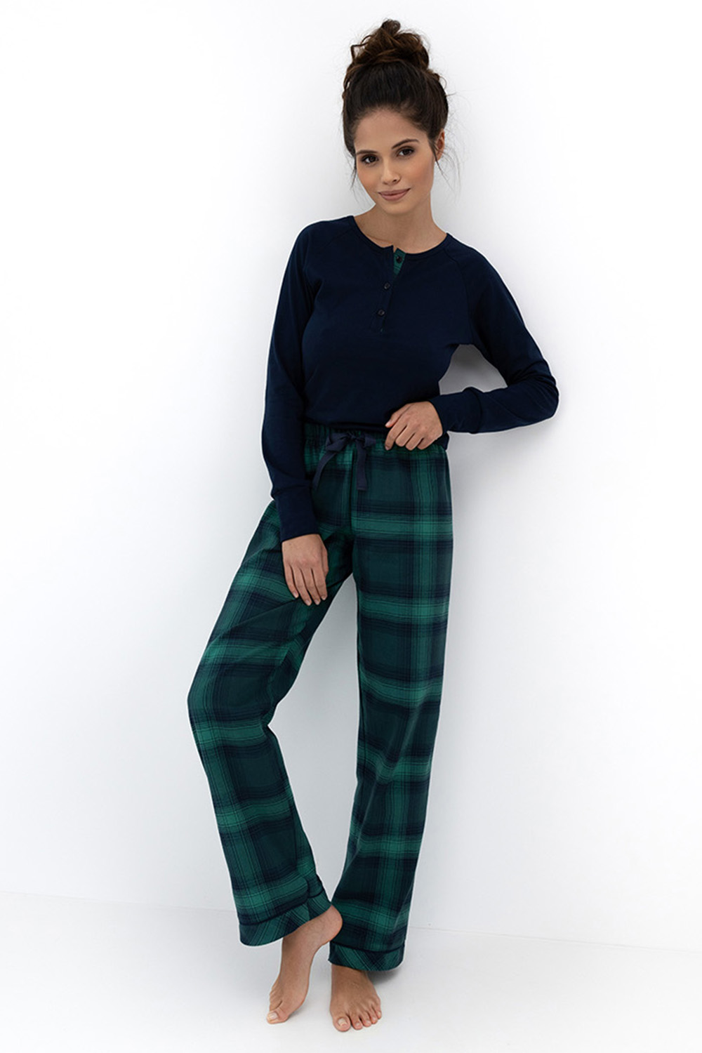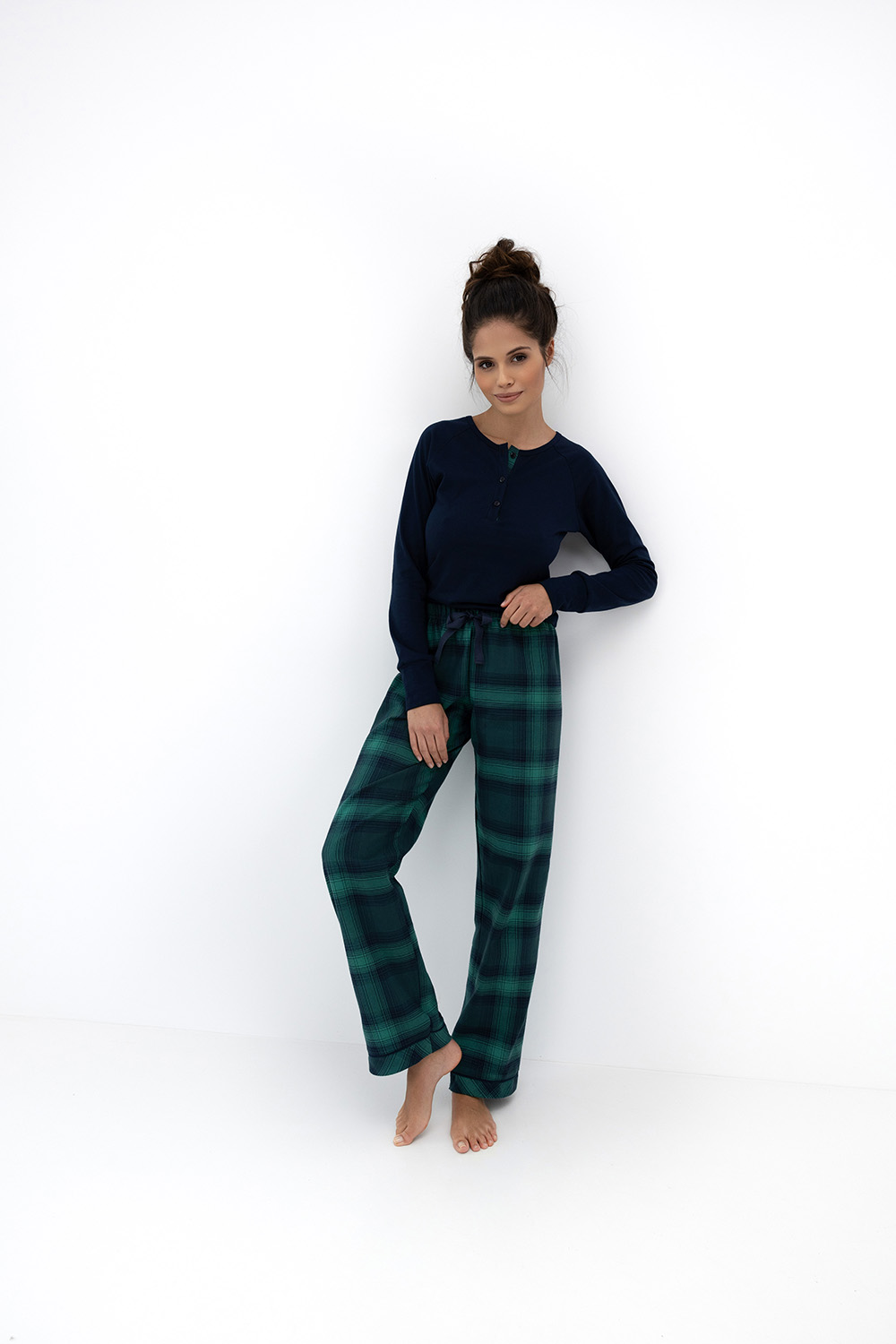 Пижама Cassandra состоит из прямых брюк и однотонного лонгслива с длинным рукавом. Брюки в крупную клетку, пояс декорирован контрастным бантиком. Идеальный вариант не только для сна, но и для домашнего отдыха.
