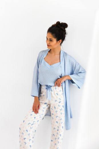 Легкая пижама Edita с топом и брюками. Топ на тонких бретелях с v-образным вырезом. Брюки прямого кроя с принтом бабочки и контрастным кантом.