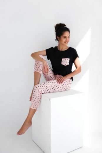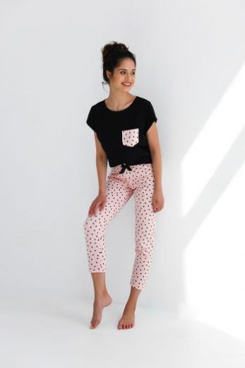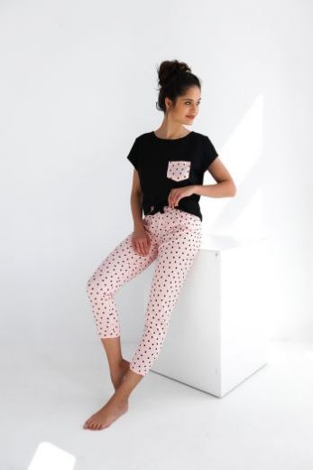Яркая пижама Ilaria состоит из зауженных укороченных брюк и футболки свободного кроя. Футболка однотонная с круглым вырезом горловины и контрастным карманом с принтом сердечки по аналогии с брюками. Элемент декора: миниатюрный атласный бантик.
