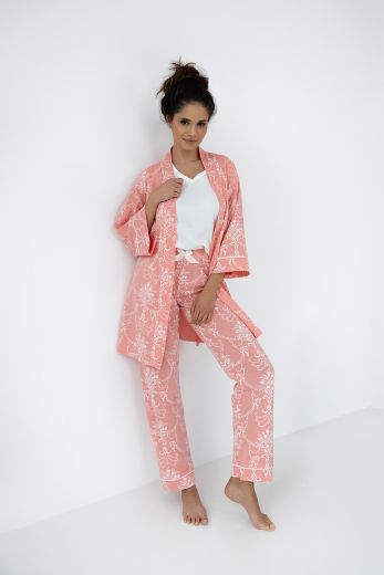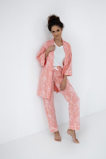 Изысканная пижама Kalina состоит из футболки и брюк. Футболка однотонная с v-образным вырезом. Брюки прямые с интересным принтом. Идеальный вариант не только для сна, но и для домашнего отдыха.