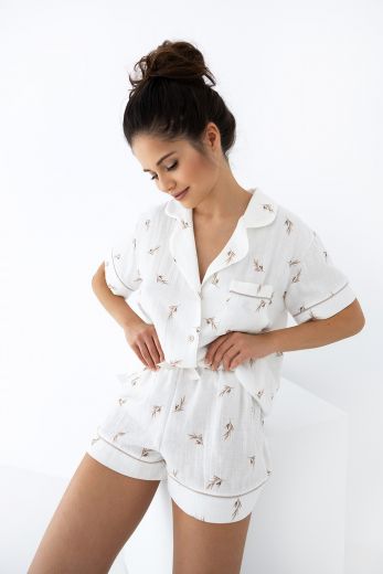 Пижама Nastia: романтичная домашняя одежда с растительным принтом. Прямая рубашка на пуговицах и шортики с атласным бантиком — идеальный выбор для сна и отдыха дома.