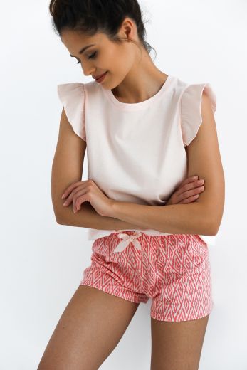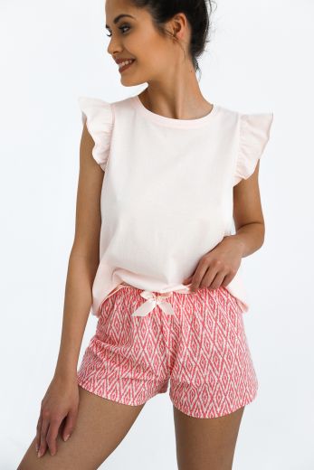 Легкая пижама Vittoria состоит из однотонной футболки и шортиков. Футболка имеет небольшой круглый вырез горловины. Рукава оформлены рюшами. Шортики прямого кроя декорированы контрастным геометрическим принтом и изящным атласным бантиком.