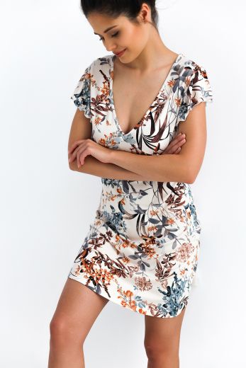 Платье-сорочка Dolores с глубоким v-образным вырезом горловины и рукавами-воланами. Выполнена с ярким растительным принтом. Элемент декора: миниатюрный бантик на груди.