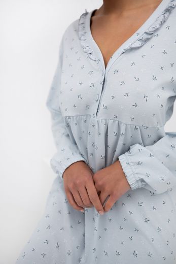 Очаровательное домашнее платье Lucille нежного небесного оттенка. Воротник с v-образным вырезом, с рюшами, на кулиске. Рукава оформлены манжетами. Идеально подойдет не только для сна, но и для отдыха в домашней обстановке.