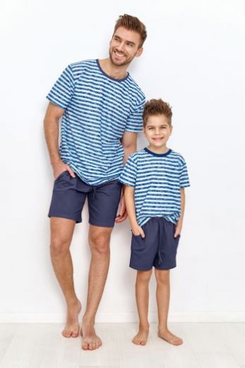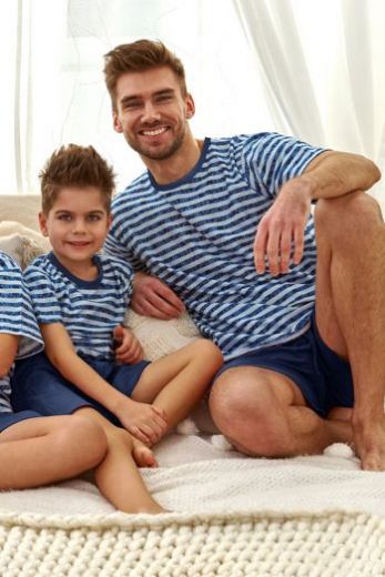 Пижама для мальчиков Noah, состоит из футболки в полоску и однотонных шорт. Футболка свободного кроя с короткими рукавами и круглым вырезом горловины. Шорты на широкой мягкой резинке, по бокам карманы, по ширине регулируются внутренним шнурком. Пижама идеально подходит для сна и в качестве домашнего костюма.
