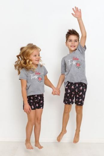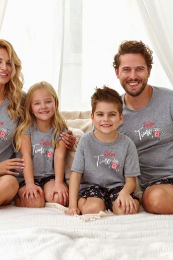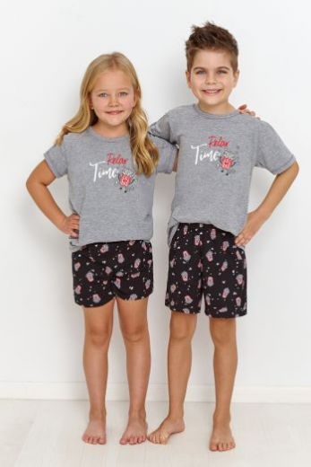 Серая пижама для девочек Relax из шорт и футболки. Футболка с коротким рукавом и принтом на груди. Шорты из 100% хлопка с милым принтом на мягкой и комфортной резинке. Идеально подходит для сна и в качестве домашнего комплекта.