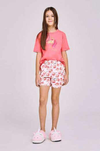 Розовая пижама для девочек-подростков Mila из футболки и шорт. Свободная футболка с коротким рукавом и принтом на груди. Шорты на мягкой и комфортной резинке. Идеально подходит для сна и в качестве домашнего комплекта.