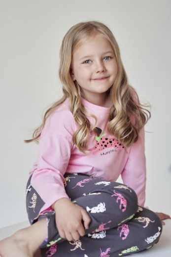 Хлопковая пижама для девочек Ruby. Пижама выполненная из качественного и мягкого хлопка, состоит из кофты и брюк. Кофта свободного кроя, с длинными рукавами и круглым вырезом горла, прямые брюки с принтом. Спереди кофта украшена забавным принтом.