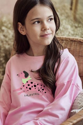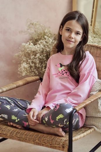 Хлопковая пижама для девочек-подростков Ruby. Пижама выполненная из качественного и мягкого хлопка, состоит из кофты и брюк. Кофта свободного кроя, с длинными рукавами и круглым вырезом горла, прямые брюки с принтом. Спереди кофта украшена забавным принтом.
