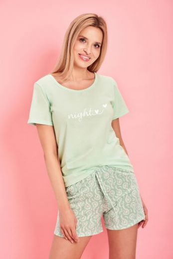 Светло-зеленая женская пижама Gloria. Однотонная футболкаВ В с надписью на груди и шорты с принтом. Футболка с коротким рукавом и круглым вырезом горла. Прямые шорты с мягкой резинкой в поясе. Идеально подходит для сна и в качестве домашнего комплекта.