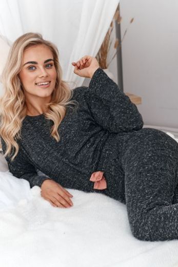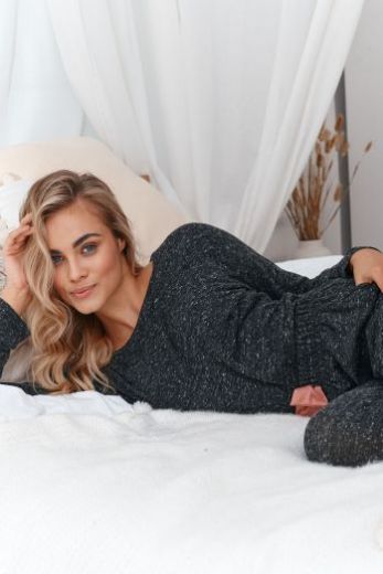 Черная вискозная пижама Victoria. Футболка с длинныи рукавом и круглым вырезом горла. Укороченные брюки с мягкой резинкой в поясе и удобными боковыми карманами дополнены бантом розового цвета. Идеально подходит для сна и в качестве домашнего комплекта.