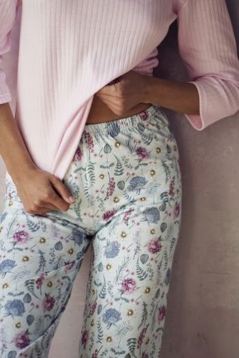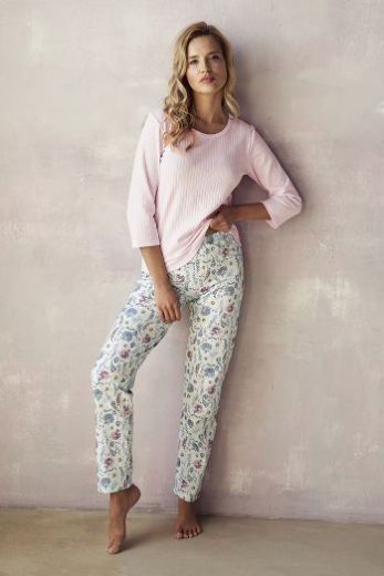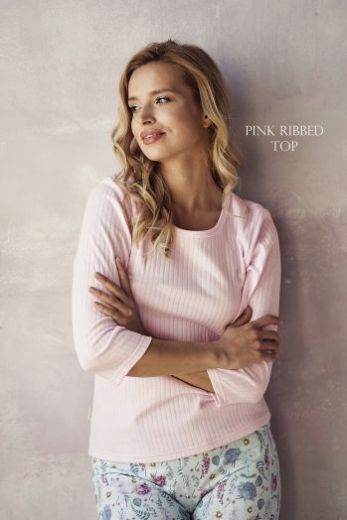 Розовая пижама Amora. Однотонная футболка из хлопкового полотна в рубчик, с рукавом 3/4 и круглым вырезом горла. Прямые брюки с цветочным принтом на широкой мягкой резинке.