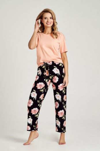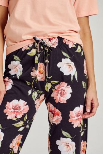Пижама Margot состоит из персиковой футболки и хлопковых брюк с цветочным принтом. Идеально подходит для сна и в качестве домашнего комплекта.