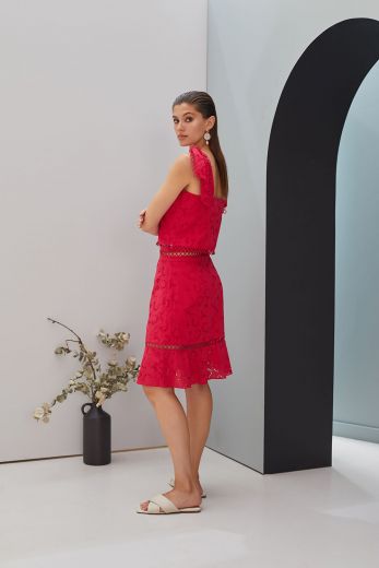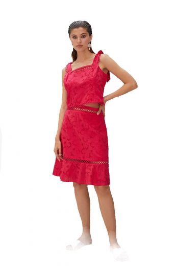 Юбка А-силуэта средней длины цвета фуксия. Хлопковая ткань кроше с оригинальным флористическим рисунком в сочетании с дизайнерской тесьмой в виде колец создают неповторимый образ. Изделие отличается женственностью и утонченностью и подойдет, как для долгих летних прогулок, так и для вечерних свиданий.