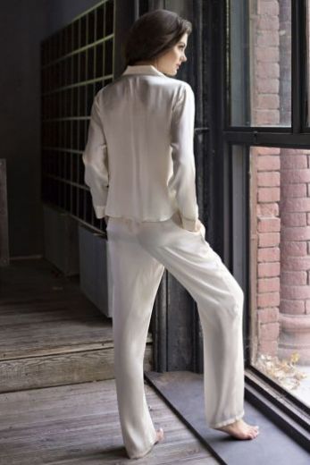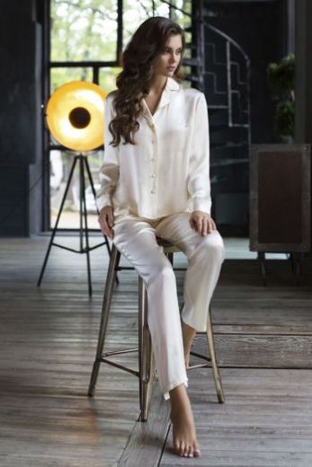 Классическая пижама Mia-Mia. Состоит из жакета и длинных брюк из натурального шелка. Жакет полуприлегающего покроя с застежкой на пуговицы и отложным воротником. Рукав втачной на манжете. Длинные брюки свободного покроя на эластичной тесьме (резинке) в поясе, с карманами в боковых швах.